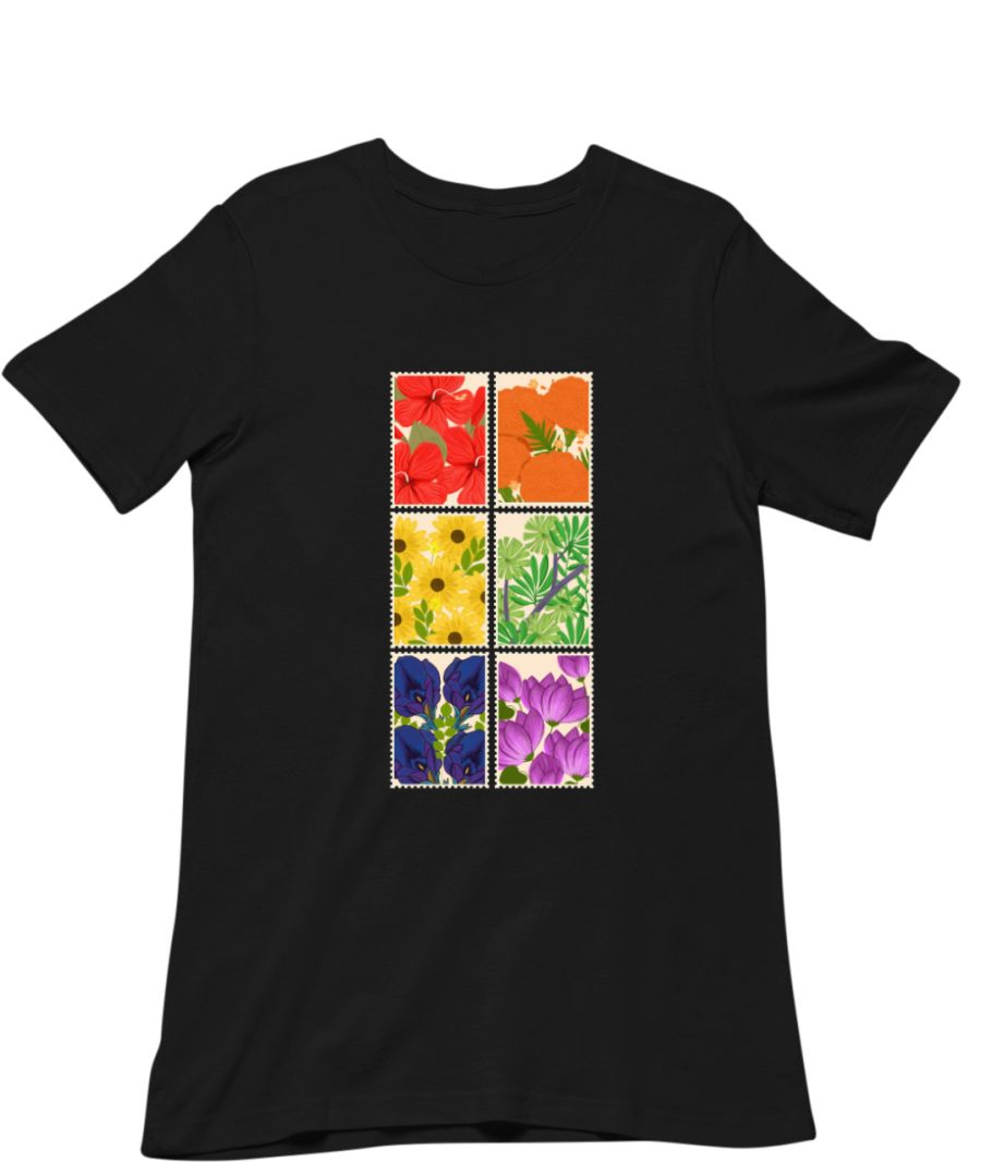 Brighten up your wardrobe with the "Rainbow Blossoms" t-shirt. This vibrant design showcases beautifully illustrated flowers that come together to form a stunning rainbow.